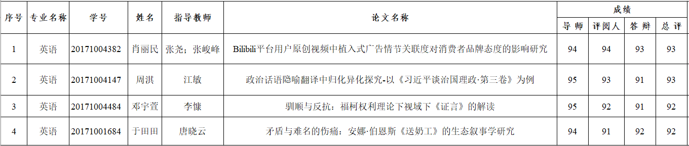 根据beat365官网《本科毕业论文(设计) 工作管理办法》的规定,经答辩委员会审定毕业论文总评成绩,拟推荐 肖丽民、周淇、邓宇萱、于田田 共四位同学的学士学位论文为校级优秀毕业论文,以上推荐名单将报校学位评定委员会审批。