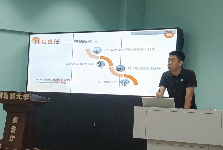 然后,beat365官网艺术与传媒学院大四学生李乐介绍了他创办的武汉松木文化科技有限责任公司的基本情况,包括公司结构、主营业务和社会责任等,并具体说明了该公司如何在文创链方面进行创新,如何在地大校园打造“地心引力”这一高校文创品牌更好地服务广大师生及校友,如何依托公司实际运营业绩积极备战“互联网+”、“三创赛”,这些都引发了同学们的积极思考。