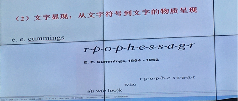 最后,罗教授为我们介绍了当代诗歌视觉美学特征,其表现为诗歌文本密度的增强,文字间不同介质间互动频率的上升,诗歌意义密度与质感不断的提升。其次,文字的声音介质与视觉文本形式互动增加了媒介形式的戏剧性,突出媒介间的对抗性,促进了诗歌的可吸收性。