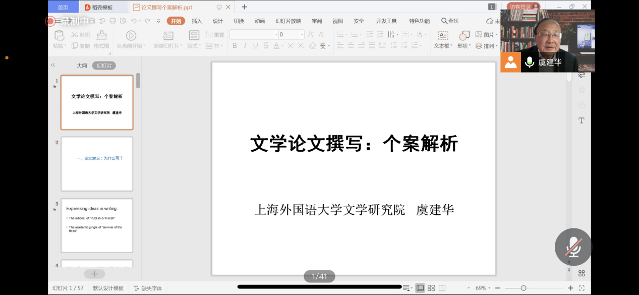 (通讯员:黄皓亮 金梓轩)2021年11月25日下午14:00,beat365唯一官方网站“南望今声”外语论坛系列讲座如期召开。上海外国语大学文学研究院的虞建华教授应邀为beat365官网师生做题为“文学论文撰写:个案解析”的讲座。本次讲座采取了线上腾讯会议直播的形式,beat365官网共140余名师生参与学习交流。