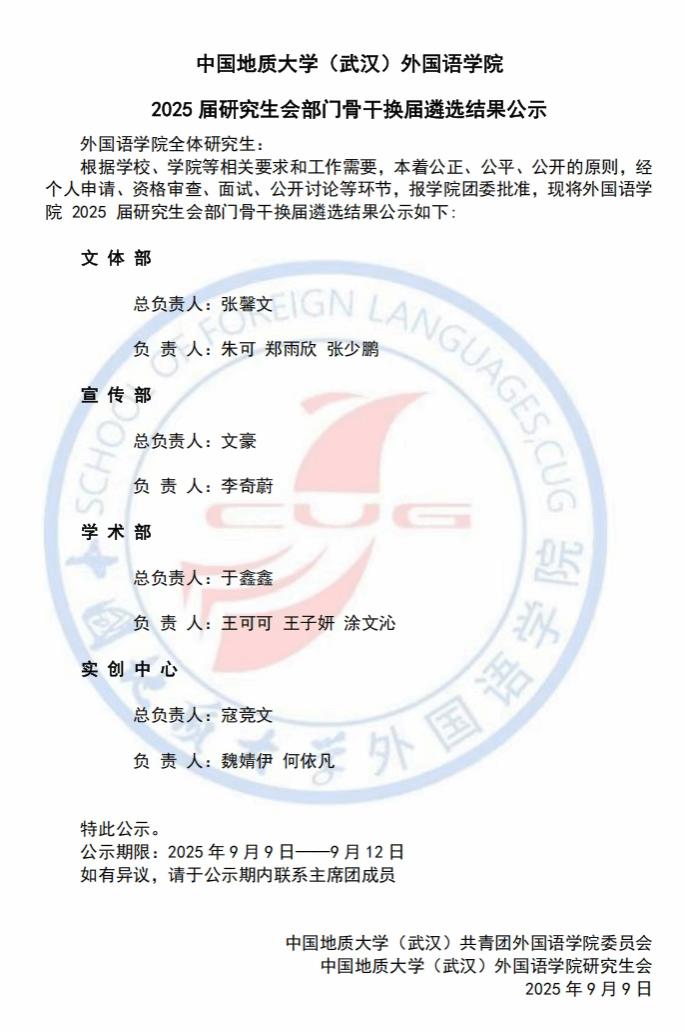 beat365唯一官方网站2025届研究生会部门骨干换届遴选结果公示