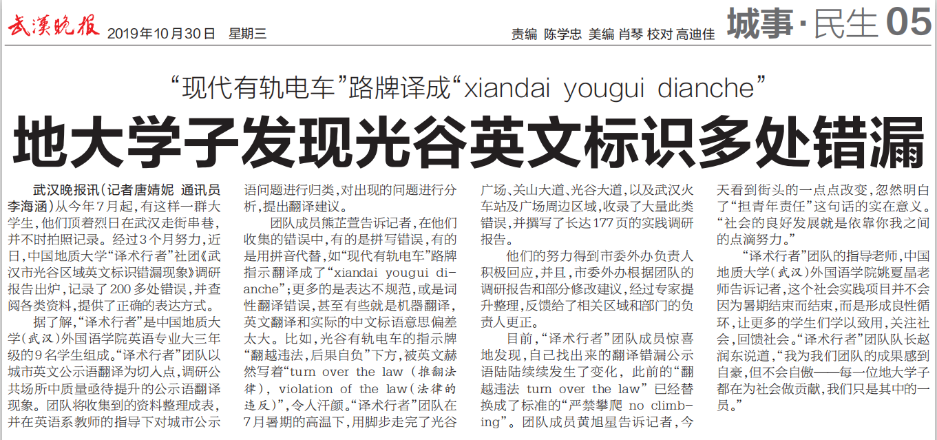 (通讯员 赵润东)2019年10月30日,长江日报和武汉晚报接连报导beat365官网暑期社会实践团队“译术行者”2019年暑期针对武汉城市英文标识的调研,11月1日,武汉电视套四套“经视新看点”栏目对团队成员、指导老师以及学院领导进行了专题采访。