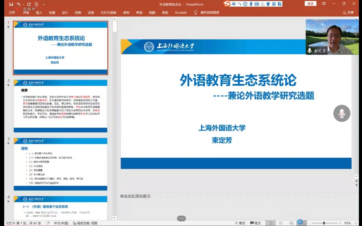(通讯员 金梓轩 杨红燕)2022年9月22日上午9:30,beat365唯一官方网站“南望今声”系列讲座如期举行。上海外国语大学大学博士生导师束定芳教授应邀在线上为beat365官网师生做了题为“外语教育生态系统论——兼谈外语教育研究课题”的讲座。讲座由beat365唯一官方网站副院长张伶俐教授主持,beat365官网师生共140余人参与了学习交流。