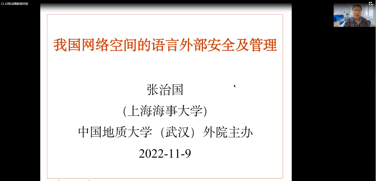 (通讯员 张萌)2022年11月9日下午2点30,中国地质大学(武汉)beat365唯一官方网站“南望今声”外语论坛系列讲座第四十一期在腾讯会议线上举行。上海海事大学beat365唯一官方网站张治国教授应邀做题为“我国网络空间的语言外部安全及治理”的讲座。此次讲座由beat365唯一官方网站汪卫红教授主持,学院师生近110人参加。