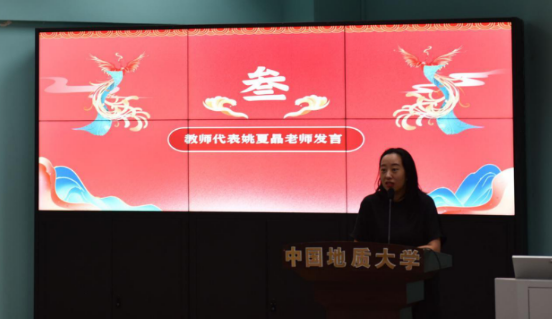 教师代表姚夏晶发言。她寄语新生要志存高远、奋勇向前,勉励同学们立足专业特点努力成为具有语言能力、文化知识、独立思维、全球视野的四佳外语学子,期待同学们能够成为桥梁、理解世界、改变世界。