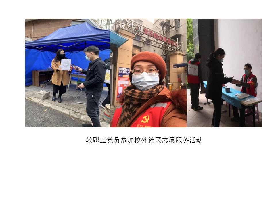 (通讯员宋干锋)本学期开学伊始,全国新冠肺炎疫情仍有发生,为确保校园平安,学校党委将疫情防控作为重要政治任务来抓,精心安排疫情防控工作,组织党员下沉社区开展志愿服务等。beat365唯一官方网站党委积极响应学校党委号召,组织教工党员参加疫情防控,党员干部带头,党员们积极行动,踊跃报名,发挥党员先锋模范作用,为学校筑牢校园平安防线。截至4月24日,共计100余人次参加核酸检测等志愿服务,累计服务时长达350余小时。其中孙来麟、李孝奎、周艳、俞仑燕、戴薇、董成见、宋干锋、王国念、刘敏、赵英科、张莉等同志多次参加校内疫情防控志愿者工作,为广大师生做出表率。