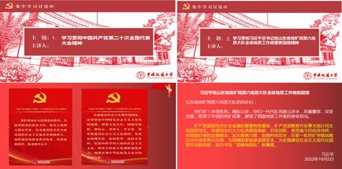 与会党员教师集中学习了中国共产党第二十次全国代表大会精神和习近平总书记给山东省地矿局第六地质大队全体地质工作者重要回信精神。
